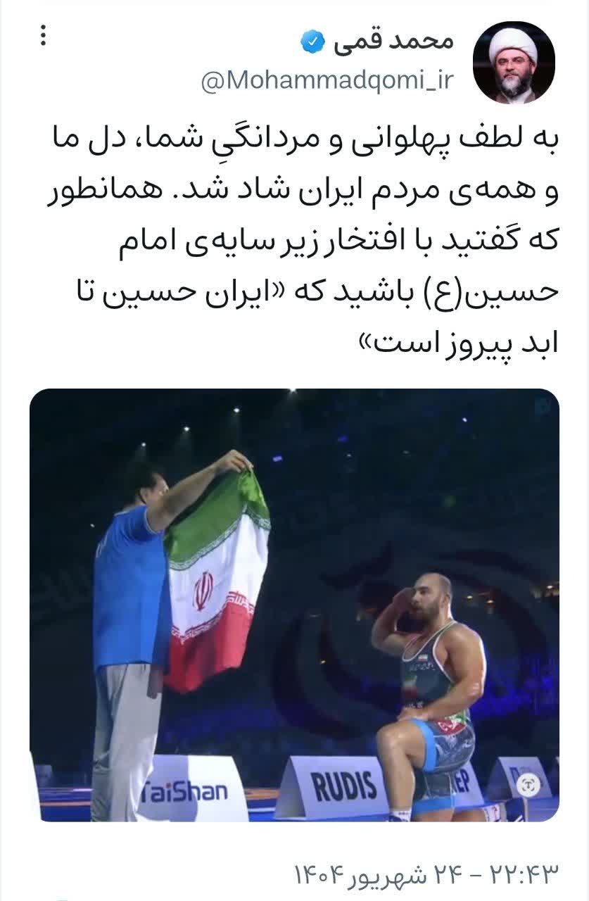 ۲۴ شهریور | پیام حجت‌الاسلام قمی در پی قهرمانی تیم کشتی کشورمان؛