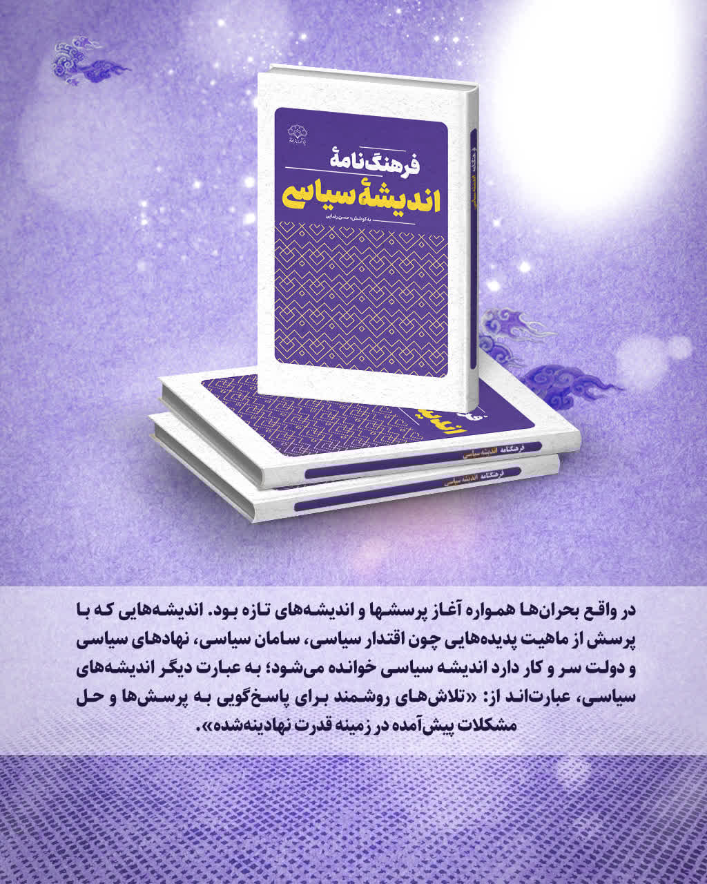 کتاب «فرهنگ‌نامه اندیشه سیاسی» که به کوشش حسن رضایی در ۸۳۲ صفحه و با شمارگان ۱۰۰۰ نسخه توسط انتشارات پژوهشکده تبلیغ و مطالعات اسلامی باقرالعلوم (علیه‌السلام) منتشر شده است، به تمامی مباحث مهم اندیشه سیاسی می‌پردازد. موضوعاتی مانند اپوزیسیون، دموکراسی، انقلاب، اسلام سیاسی، ولایت فقیه و بسیاری دیگر در این فرهنگ‌نامه بررسی شده‌اند. از مزایای این مجموعه، دسترسی آسان به موضوعات مرتبط به ترتیب حروف الفبا و ارائه مباحث مهم اندیشه سیاسی به شیوه‌ای قابل فهم برای طلاب و دانشجویان، با حفظ وزانت علمی است.