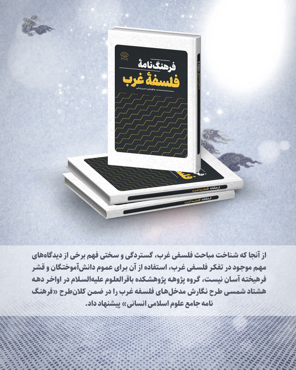 کتاب «فرهنگ‌نامه فلسفه غرب»، به کوشش حسن رضایی، در قطع وزیری، با ۶۷۲ صفحه و شمارگان ۱۰۰۰ نسخه، اخیراً توسط انتشارات پژوهشکده باقرالعلوم (ع) منتشر شده است.