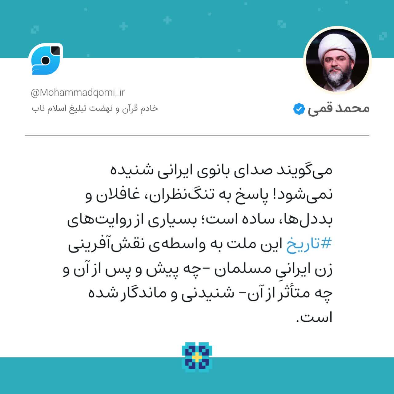 به گزراش روابط عمومی سازمان تبلیغات اسلامی، حجتالاسلام محمد قمی، رئیس سازمان تبلیغات اسلامی در روز وفات حضرت معصومه (س) و پس از اشاره به فرصت اجتماعی حضور بانوان ایرانی در صفحهی شخصی خود در شبکه اجتماعی ویراستی نوشت؛