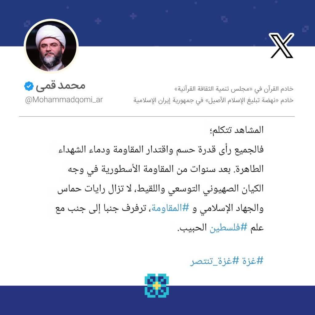 به گزارش روابط عمومی سازمان تبلیغات اسلامی، حجت‌الاسلام محمد قمی، رئیس سازمان تبلیغات اسلامی، با بازنشر تصاویری از شادی فلسطینی‌ها در استقبال از اسرای تازه آزادشده‌شان از زندان‌های رژیم صهیونیستی و اقدام رسانه‌ای هوشمندانه‌ی رزمندگان مقاومت، لحظاتی پیش از تحویل اسرای صهیونیستی در صفحه شخصی خود در شبکه اجتماعی ایکس و به زبان عربی نوشت؛