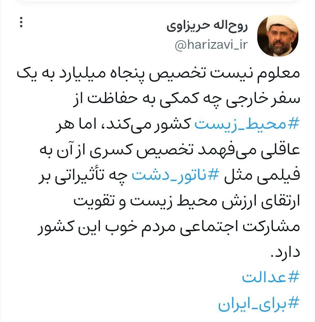 معاون آموزش و تعالی سازمان تبلیغات اسلامی در صفحه شخصی خود در شبکه اجتماعی ایکس با انتقاد از اولویت‌گذاری‌های بودجه‌ای دولت تأکید کرد: اختصاص پنجاه میلیارد به یک سفر خارجی بی‌فایده است، در حالی‌ که حمایت اندک از آثاری چون «ناتور‌دشت» می‌تواند فرهنگ محیط‌زیست و مشارکت اجتماعی را تقویت کند.