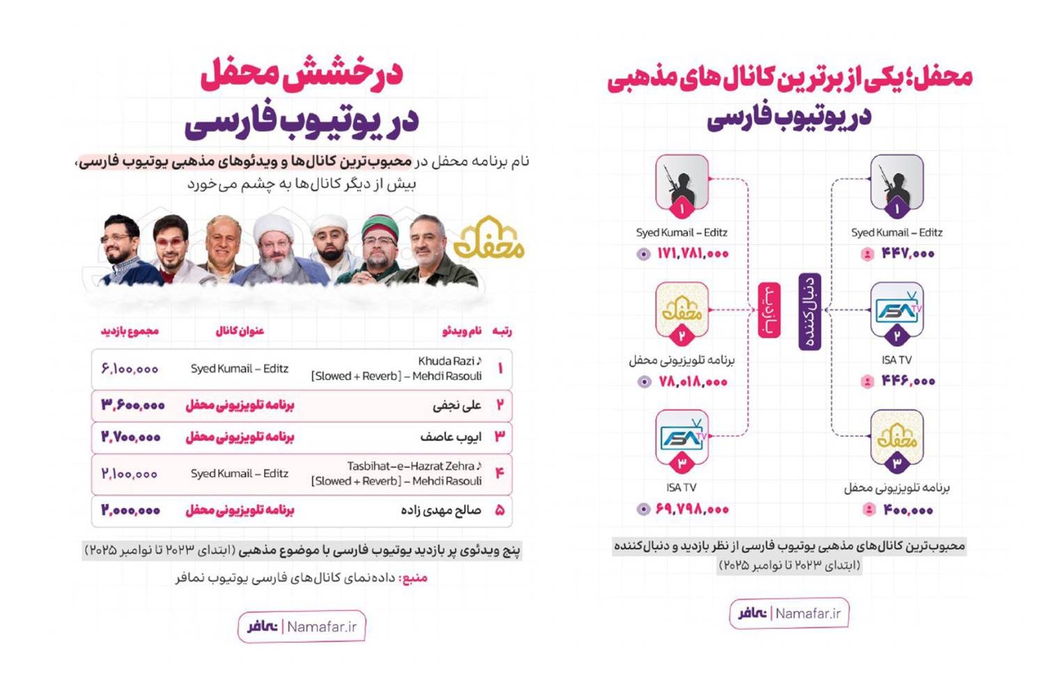 داده‌های آماری نمافر، پایگاه آماری و تحلیلی از صنایع فرهنگ بنیان و خلاق در ایران و جهان نشان می‌دهد که در بازه سال‌های ۲۰۲۳ تا اواخر ۲۰۲۵، کانال برنامه محفل در یوتیوب فارسی با جذب نزدیک به ۴۰۰ هزار دنبال‌کننده و ثبت رکورد بیش از ۵۴ میلیون بازدید، بر سکوی سوم‌ ایستاده است. اما آنچه این آمار را فراتر از اعداد صرف می‌برد، ضریب نفوذ و «وایرال» شدن محتوای آن است. حضور سه ویدئو از محفل (اجرا‌های علی نجفی، ایوب عاصف و صالح مهدی‌زاده) در میان پنج ویدئوی برتر این بازه، نشان می‌دهد که این برنامه توانسته با عبور از فرم‌های کلیشه‌ای، لحظاتی خلق کند که پتانسیل اشتراک‌گذاری بالایی دارند. در واقع محفل با تکیه بر جذابیت‌های بصری و صوتی قرآن و نوا‌های آیینی، برنده‌ای تمام‌عیار در جنگِ توجهِ پلتفرم‌های مدرن بوده و مخاطبانی فراتر از دایره سنتی مذهبی‌ها را نیز پای گیرنده‌های دیجیتال نشاند. اما ویدئو‌های رکورد شکن برنامه محفل مربوط به چه اجرا‌هایی بود؟