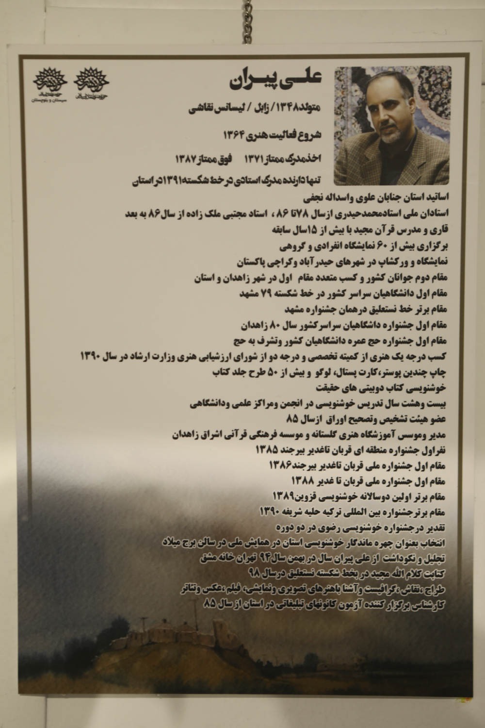 استاد علی پیران در مورد نمایشگاه آبرنگ «نقش نیمروز» خبر داد این آثار با تکنیک آبرنگ کشیده شده و شامل طبیعت، معماری و آثار رو به نابودی سیستان و بلوچستان است.