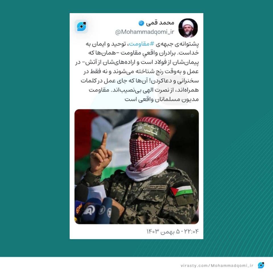 به گزارش روابط عمومی سازمان تبلیغات اسلامی، حجتالاسلام محمد قمی، رئیس سازمان تبلیغات اسلامی با انتشار تصویری از مجاهد مقاومت ابوعبیده؛ سخنگوی گردانهای عزالدین قسام، در صفحه شخصی خود و در ویراستی کنایی، از آنها که به وقت رنج در میدان عمل حاضر شدند و فقط به دعا و سخنرانی اکتفا نکردند، به عنوان برادران مقاومت و مسلمانان واقعی یاد کرد.