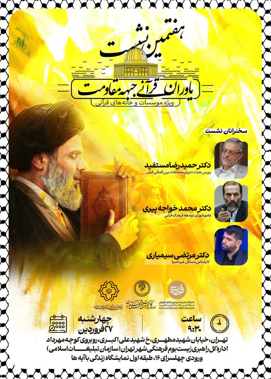 به گزارش روابط عمومی، هفتمین نشست «یاوران قرآنی جبهه مقاومت» روز چهارشنبه ۲۷ فروردینماه از ساعت ۹:۳۰ صبح، با حضور جمعی از مدیران برتر موسسات و خانههای قرآنی سراسر کشور برگزار خواهد شد.