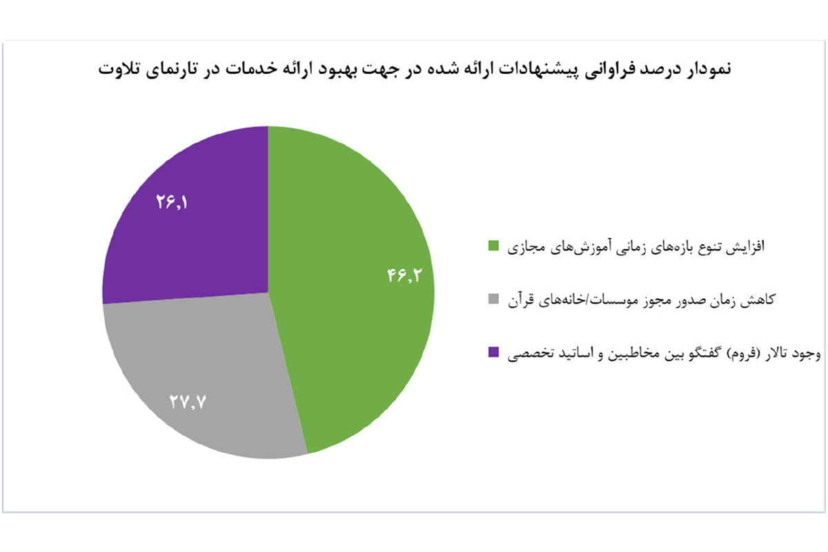 پیرو نظرات کاربران و مخاطبین خدمات قرآنی، بیشترین اقبال کاربران نسبت به پیشنهادات ارائه شده در حوزه ترویج فرهنگ قرآنی، آموزش قرائت قرآن ویژه افراد توانخواه بوده است که در این راستا نیازمند بکارگیری ابزارهای نوین آموزش در بستر آموزشهای مجازی خواهیم بود. همچنین با در نظر گرفتن نظرات در حوزه بهبود ارائه خدمات قرآنی، بیشترین تقاضای مخاطبین نسبت به افزایش تنوع بازههای زمانی آموزش قرآن کریم بوده است که نیازمند افزایش ظرفیت آموزش مجازی به عنوان یک الزام میباشد.