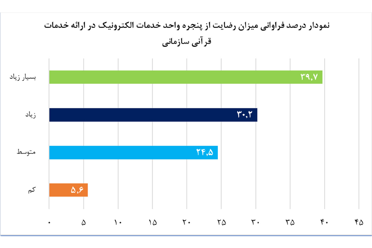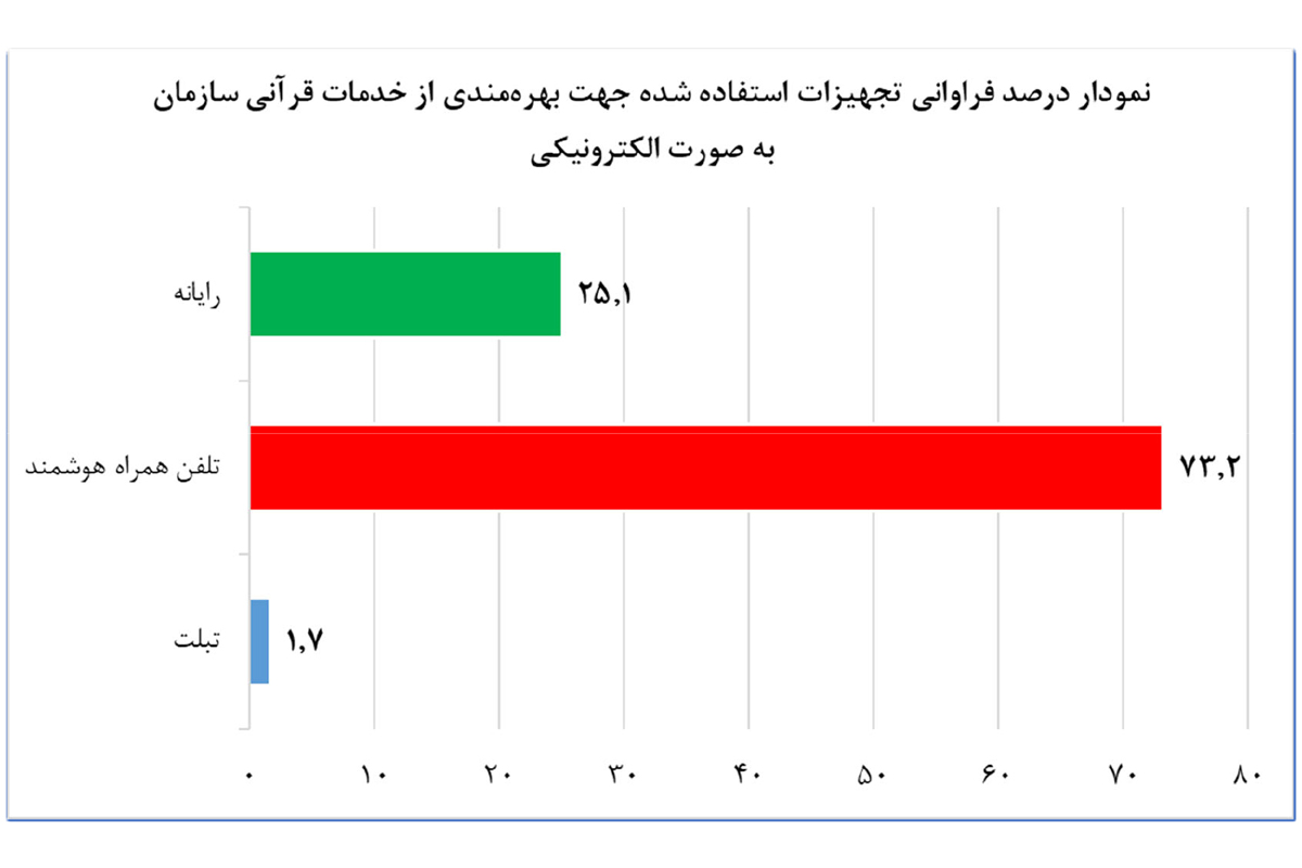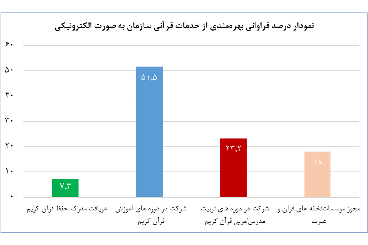 آمار دریافتی از سوال " شما از کدامیک از خدمات قرآنی سازمان تبلیغات اسلامی که به صورت الکترونیکی ارائه میگردند، بهره مند شده اید؟" نمایانگر این است که درصد قابل توجهی از مخاطبین خدمات قرآنی سازمان، از سبد خدمات الکترونیک که در این حوزه ارائه میشود، شرکت در دورههای آموزش قرآن کریم را به عنوان خدمت مورد نظر انتخاب نمودهاند. این آمار ضرورت توسعه هرچه بیشتر فرایندهای آموزش الکترونیکی را ایجاب میکند.