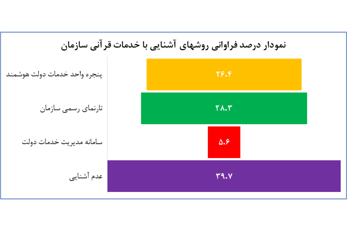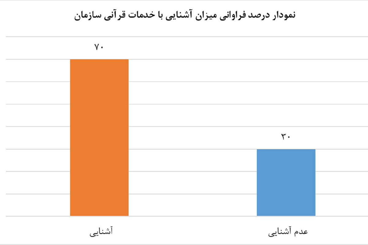 آمار دریافت شده از پاسخ سوال "آیا با خدمات سازمان دارالقرآن الکریم به عنوان متولی خدمات قرآنی سازمان تبلیغات اسلامی آشنایی دارید؟" حاکی از این است که اکثریت کاربران و متقاضیان خدمات قرآنی با سازمان دارالقرآن الکریم آشنایی دارند. همچنین با توجه به عدم آشنایی سی درصدی کاربران با سازمان دارالقرآن و خدمات آن، این مهم نیازمند بهبود فرایندهای ارائه خدمات الکترونیک در سطوح مختلف اطلاعرسانی، تولید، ارائه و پشتیبانی خدمات است.