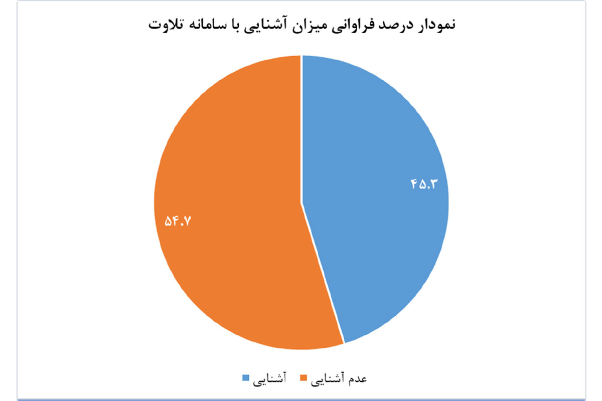بازخورد حاصل از پرسش "آیا با تارنمای تلاوت (Telavat.ir) به عنوان پرتال ارائه دهنده خدمات قرآنی سازمان تبلیغات اسلامی آشنا هستید؟" نمایانگر لزوم اهتمام در بهبود شاخصهای کمی و کیفی تارنمای تلاوت با توجه به ارزیابیهای نهادهای نظارتی و وجود شاخصها و سنجههای مرتبط با تارنماهای دستگاههای اجرایی میباشد.