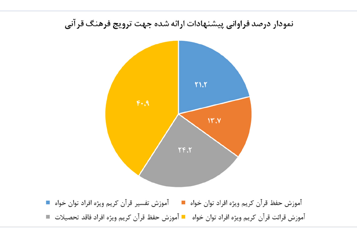 آمار دریافت شده از پاسخ سوال " کدام یک از موارد زیر را برای ترویج فرهنگ قرآنی به اقشار خاص به عنوان یک خدمت پیشنهاد میکنید؟" نشاندهنده اقبال قابل توجه مخاطبین به آموزش قرائت قرآن کریم ویژه افراد توانخواه میباشد.در این خصوص میبایست روشهای نوین آموزش الکترونیکی قرآن با رویکرد استفاده حداکثری ویژه این اقشار تدوین و اجرایی شود.