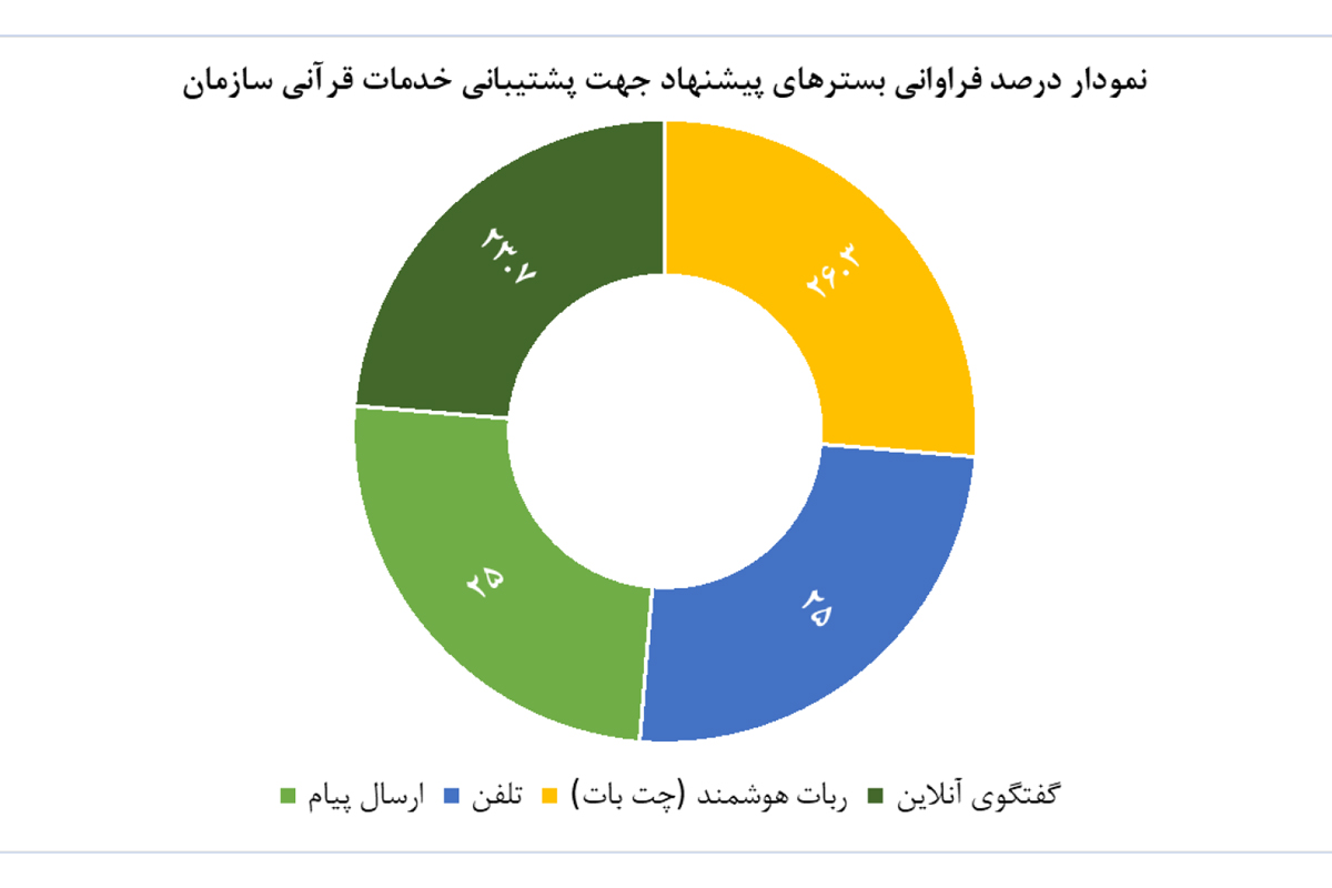 براساس پرسش " کدام یک از بسترهای ارتباطی زیر را جهت دریافت پشتیبانی از خدمات الکترونیک قرآنی مناسب میدانید؟" متقاضیان دریافت خدمات الکترونیک سازمان بسترهای متفاوتی جهت دریافت پشتیبانی خدمات الکترونیک به صورت غیرحضوری را مدنظر دارند. در این میان با در نظر گرفتن توسعه ارتباطات برخط، درصد تمایل کاربران به استفاده از پشتیبانیهای برخط (گفتگوی آنلاین و ربات هوشمند) قابل تأمل است. همچنین آمار ذیل نشان میدهد کمترین تمایل نسبت به دریافت پشتیبانی از بستر تلفن میباشد که ضرورت توسعه بسترهای پشتیبانی برخط را نمایان میسازد.