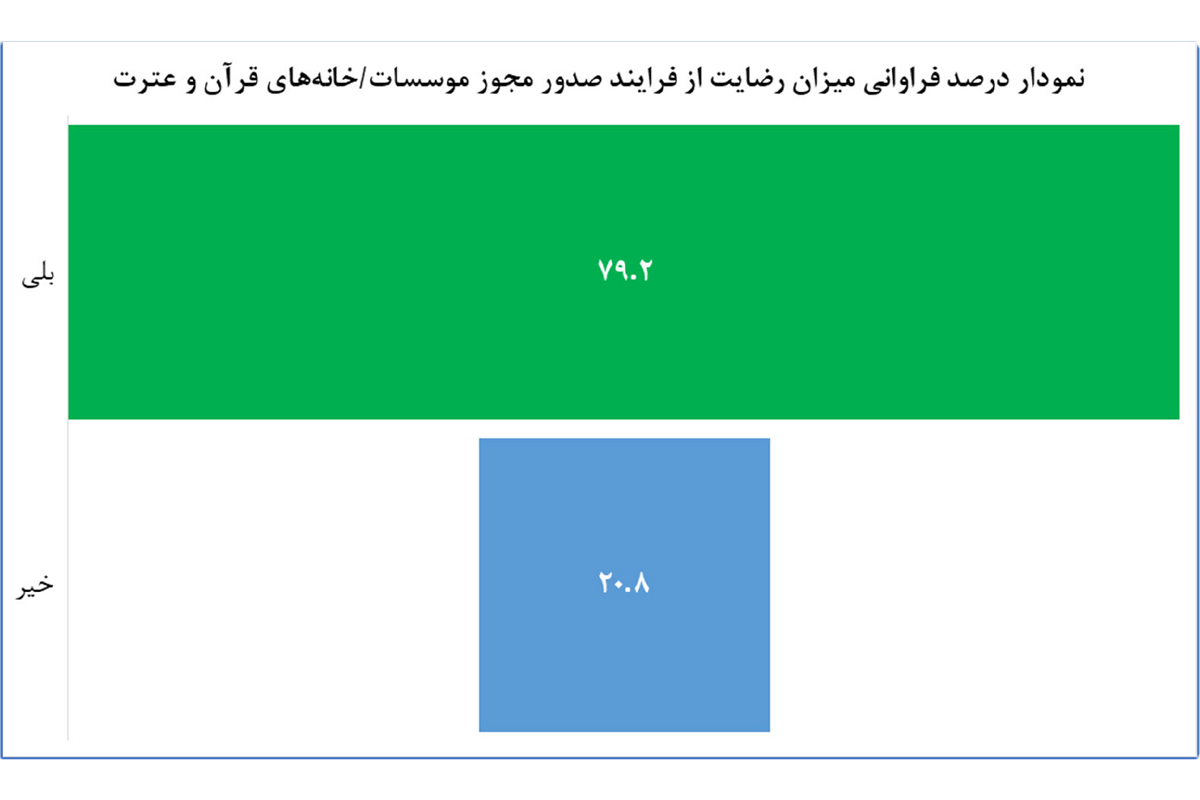 نتایج حاصل از سوال "آیا فرآیند صدور مجوز موسسات/خانههای قرآن و عترت را ساده و کاربر پسند میدانید؟" نشاندهنده رضایت حداکثری کاربران و متقاضیان خدمات قرآنی از فرایند صدور مجوز موسسات یا خانههای قرآن و عترت است. این فرایند در زمره خدمات شناسهدار سازمان نیز محسوب میشود.