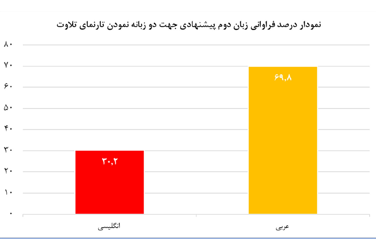 طبق آمار حاصل از سوال " برای دو زبانه شدن تارنمای ارائه خدمات قرآنی، کدام یک از زبانهای زیر را پیشنهاد میکنید؟" درصد قابل توجهی از کاربران و مخاطبین تارنمای سازمان، زبان عربی را به عنوان زبان دوم جهت چند زبانه شدن تارنمای دستگاه انتخاب کردهاند که میتوان در این راستا نسبت به توسعه تارنما به زبان عربی اقدامات لازم را به عمل آورد.