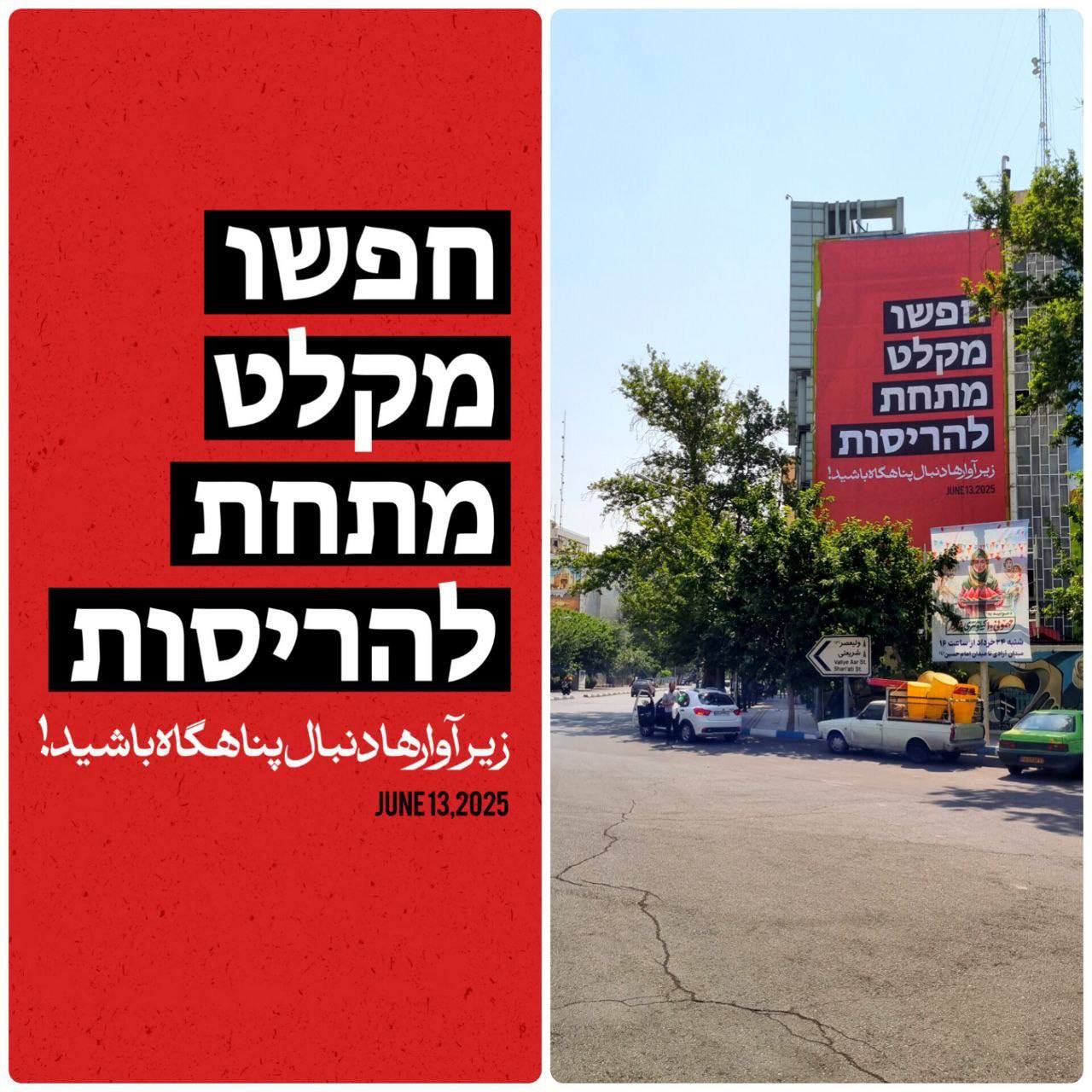 پس از جنایت سحرگاه روز 23 خرداد ماه رژیم صهیونیستی علیه کشورمان، دیوارنگاره میدان فلسطین تهران با پیامی به زبان عبری رونمایی شد: زیر آوارها دنبال پناهگاه باشید.